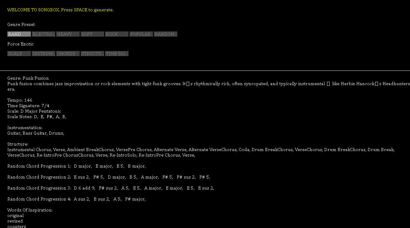 This app will generate a genre, short description of the genre, tempo, time signature, scale, tell you the notes in that scale, generate instruments to appear on the track, generate a song structure for the track (bit buggy though), 4 random chord progressions in the key of the song to play around with, and 4 words of inspiration randomly selected from a list of 100,000 english words.